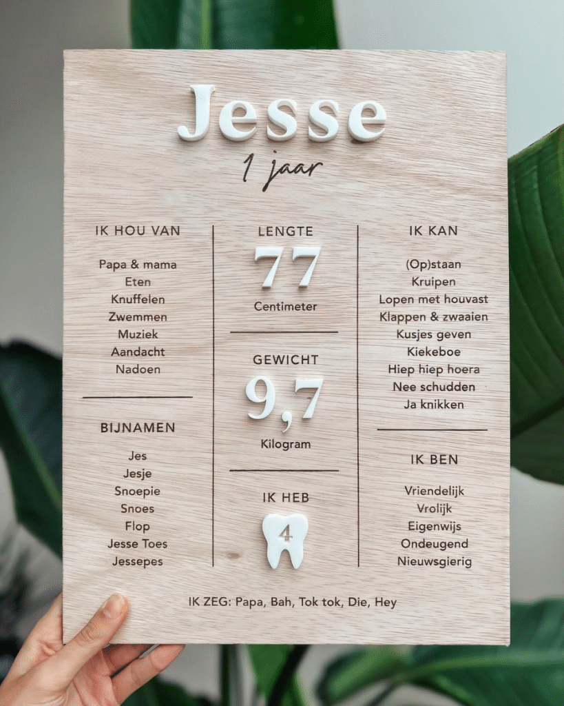 Naast het geboortekaartje kun je kiezen voor extra producten in dezelfde stijl. Zo trek je de uitstraling van het geboortekaartje door naar unieke items die een blijvende herinnering vormen. Heb je zelf een leuk idee? Laat het me weten, ik denk graag met je mee!